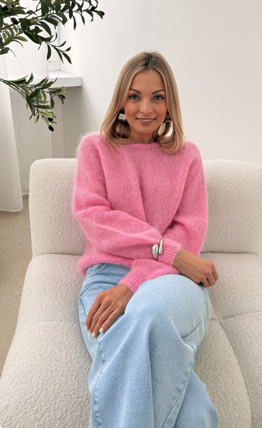 Sweter w kolorze intensywnego różu – kid mohair – miękki, puszysty.