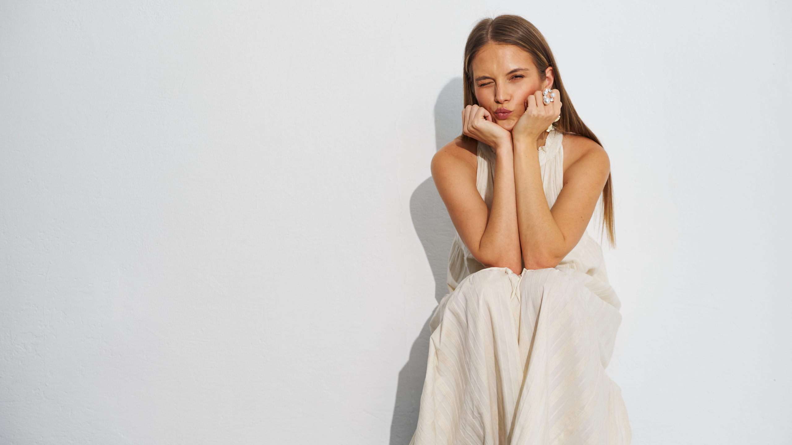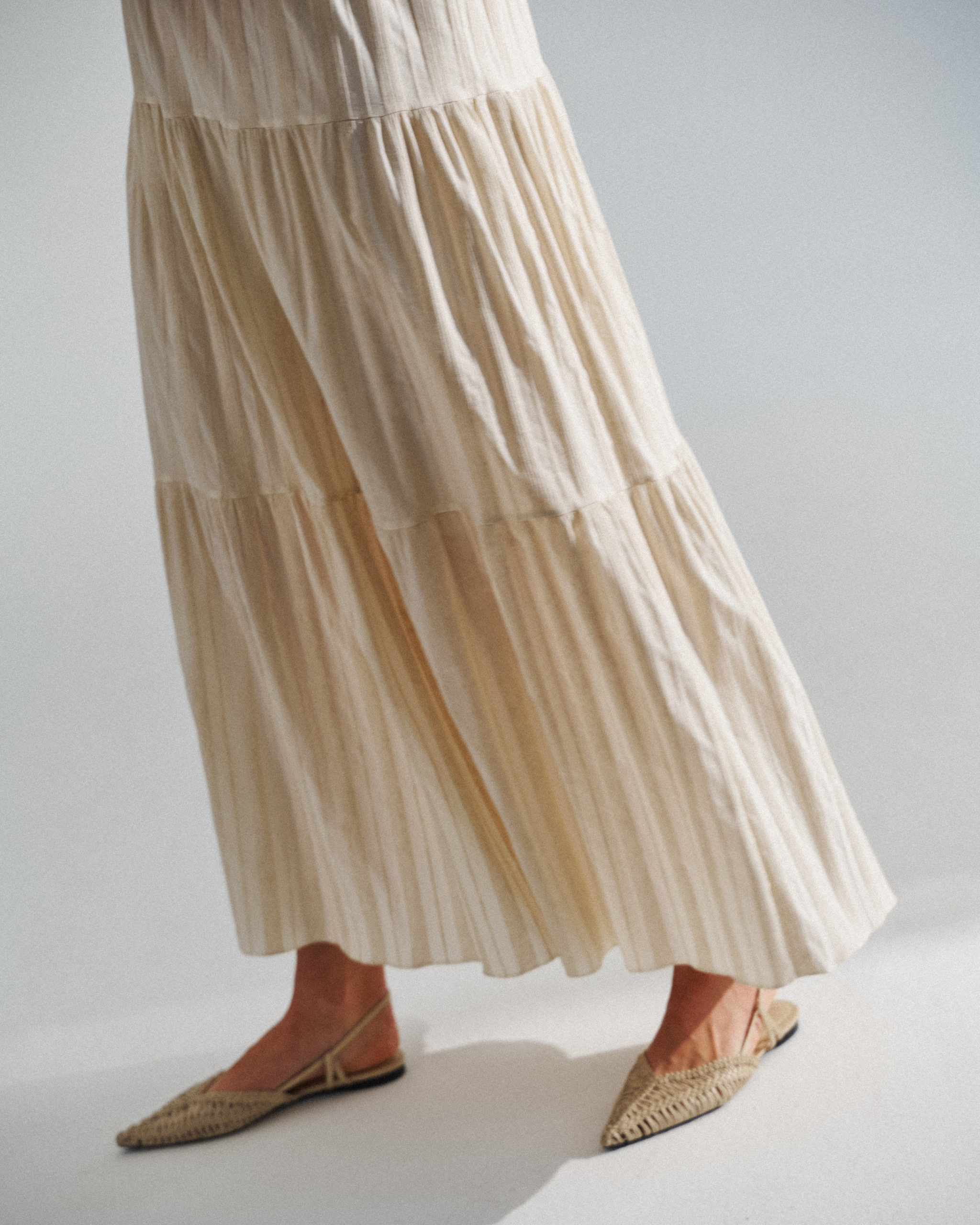Beżowa sukienka maxi ecru z falbanami bez rękawów