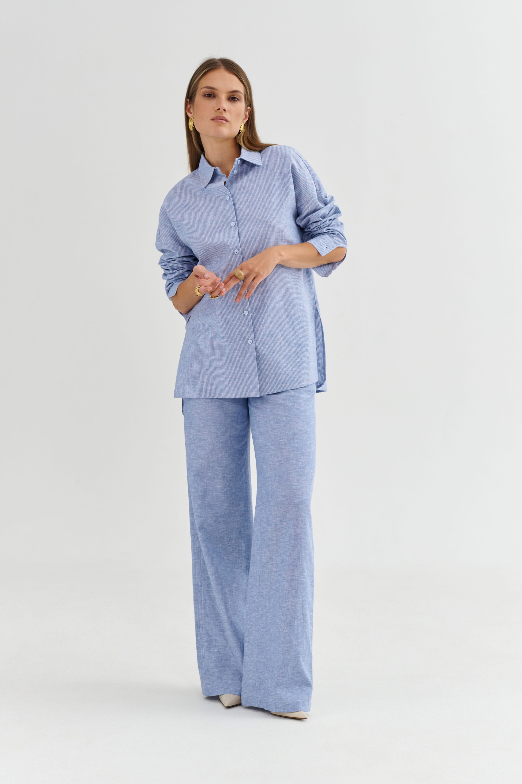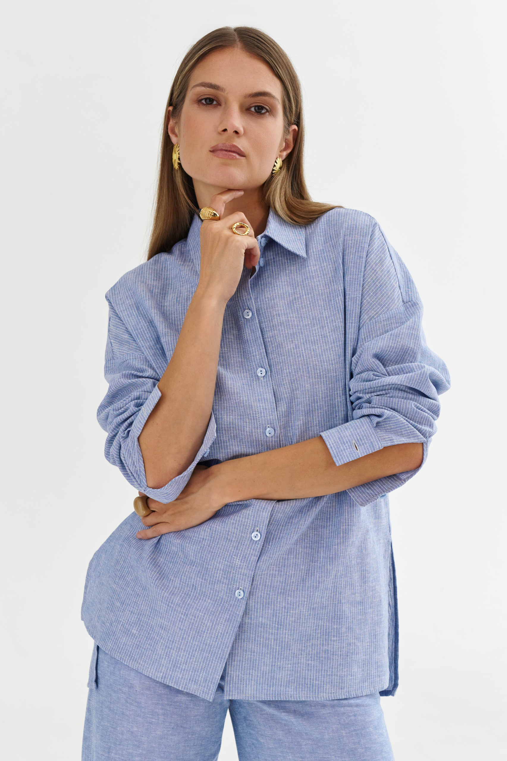 Błękitne paski i naturalna mieszanka lnu z bawełną tworzą koszulę, którą łatwo włączyć do codziennej garderoby — od biura po weekend.