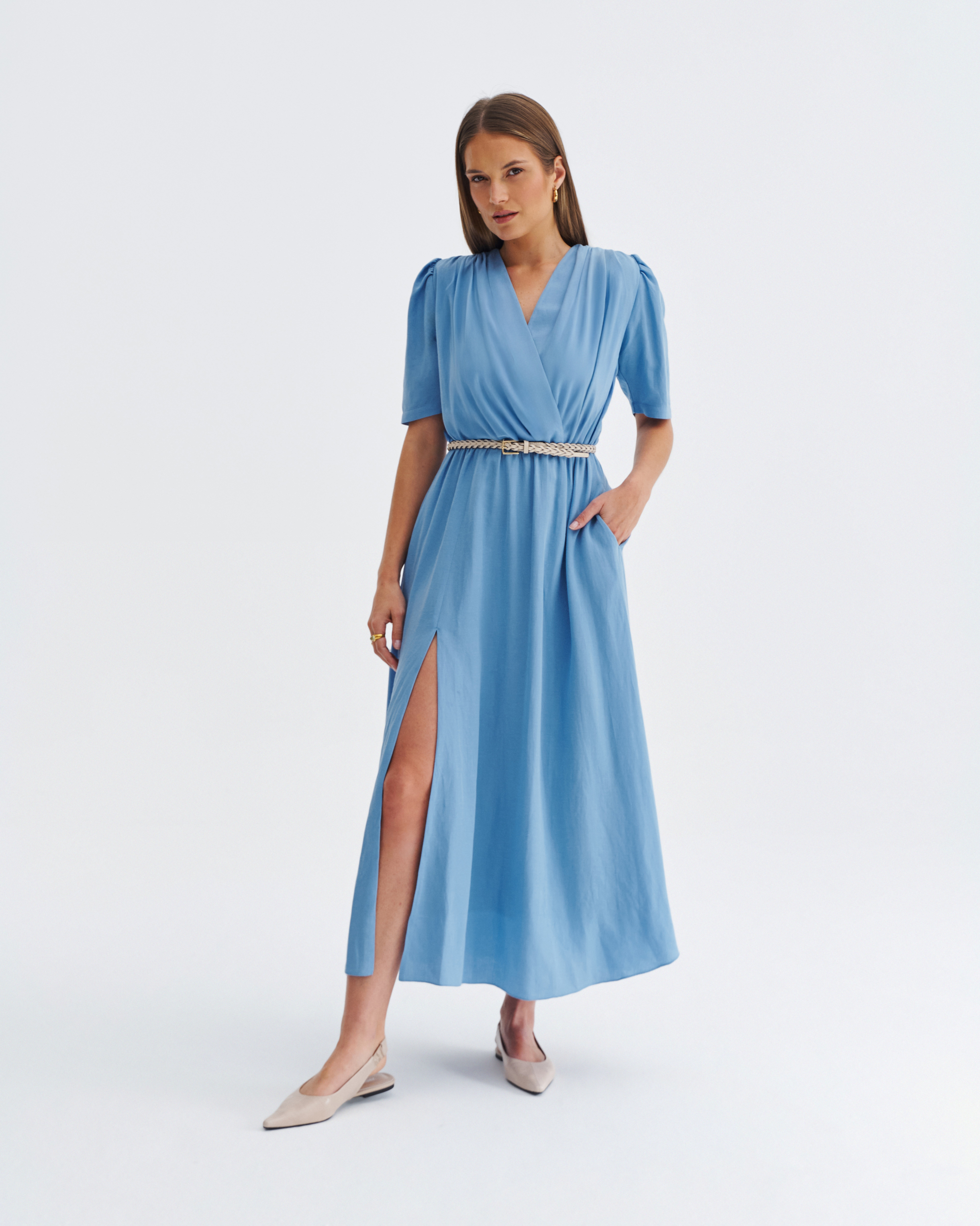 Błękitna sukienka midi z kopertowym dekoltem