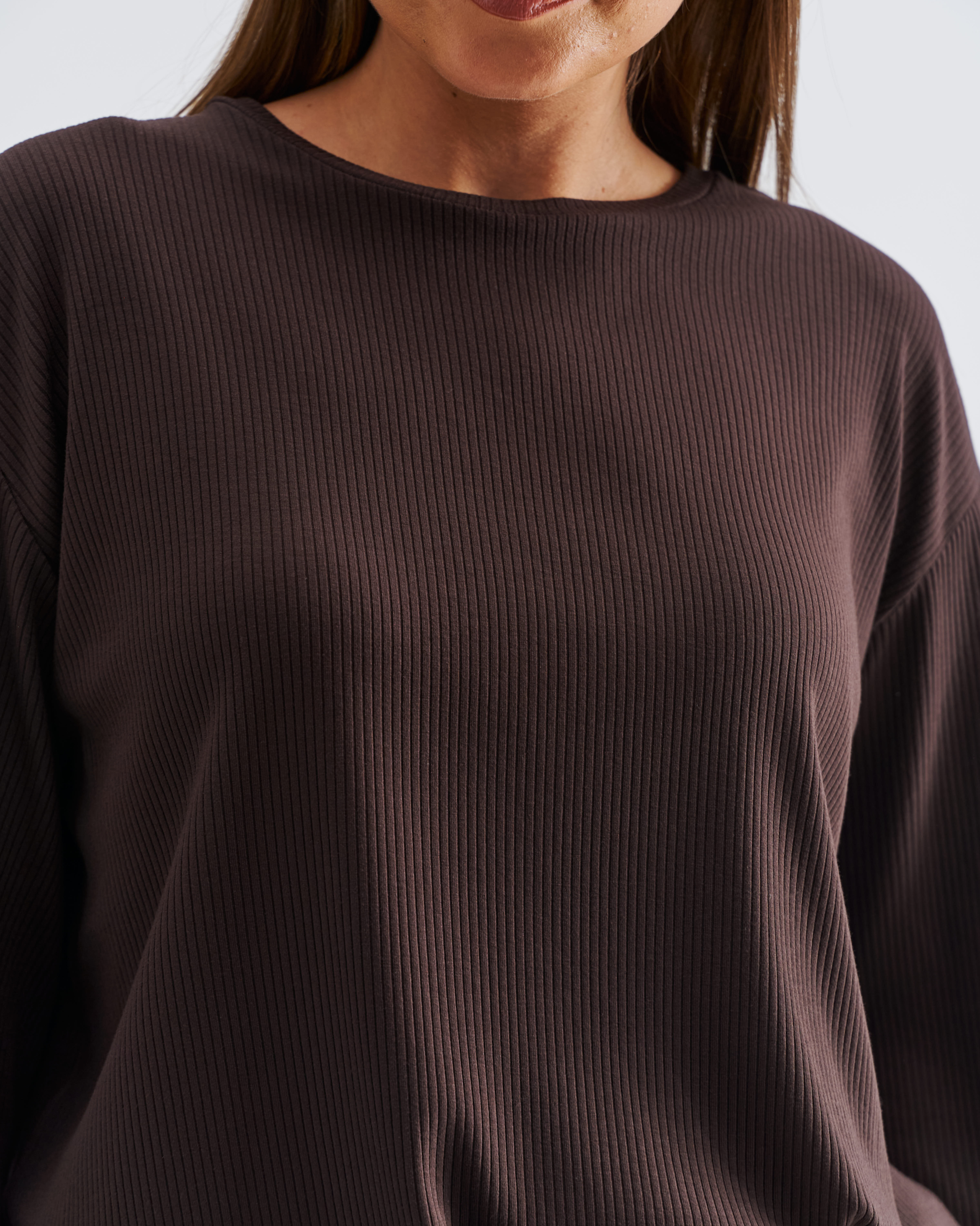 Prążkowana tkanina nadaje jej bardziej wyrazisty charakter, a głęboki odcień brązu pięknie wpisuje się w nowoczesną, kobiecą garderobę.