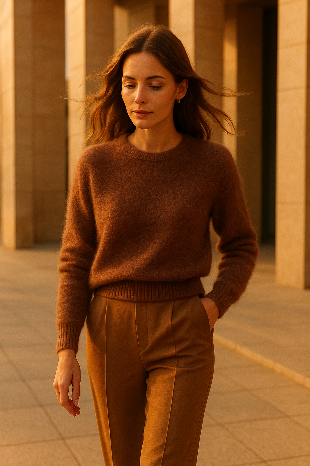 Ciepły odcień brązu doskonale współgra z karmelowymi, beżowymi i czarnymi elementami garderoby, tworząc elegancki, spójny look.