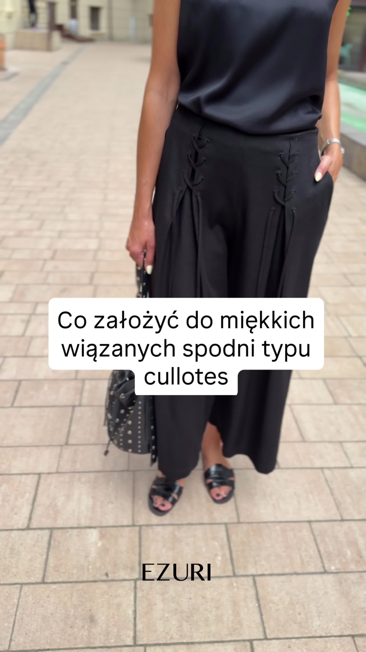 Czarne spodnie typu culottes z efektownym wiązaniem z przodu