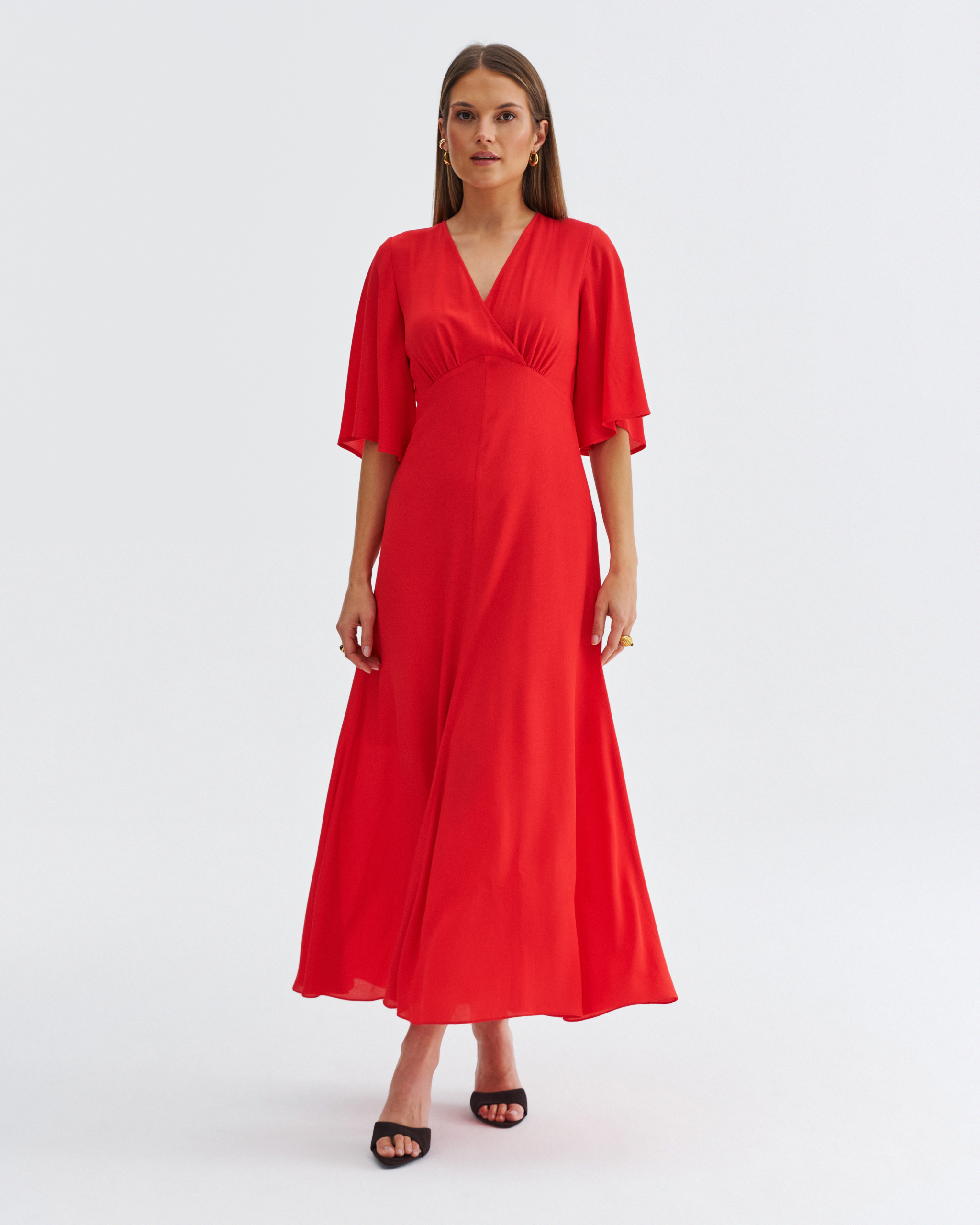 Kopertowy dekolt przepięknie optycznie wydłuża sylwetkę, a rozkloszowany dół nadają sukience wyjątkowej lekkości.