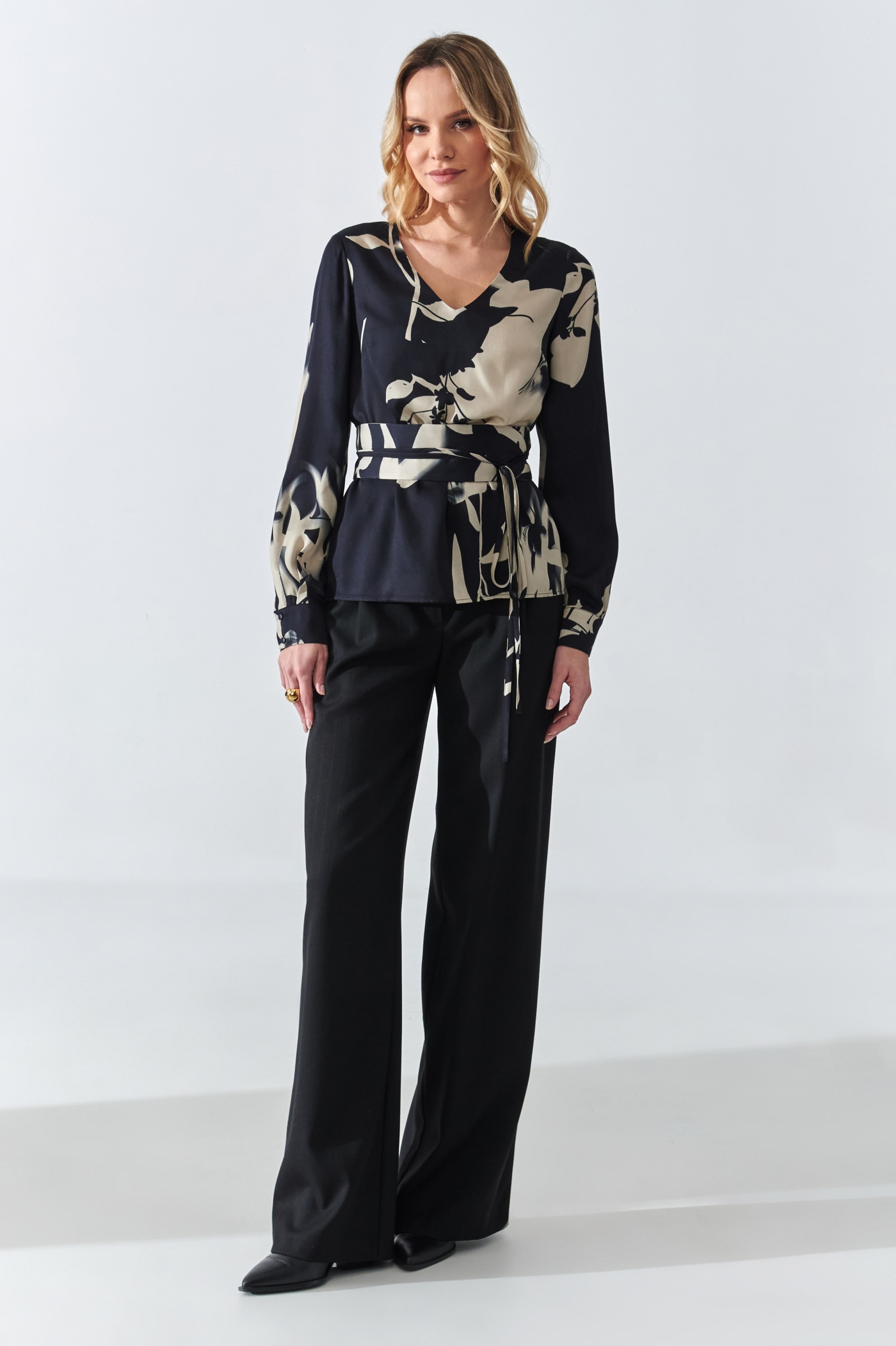 Pasek z tej samej tkaniny pozwala idealnie dopasować bluzkę do figury, pięknie podkreślając talię.