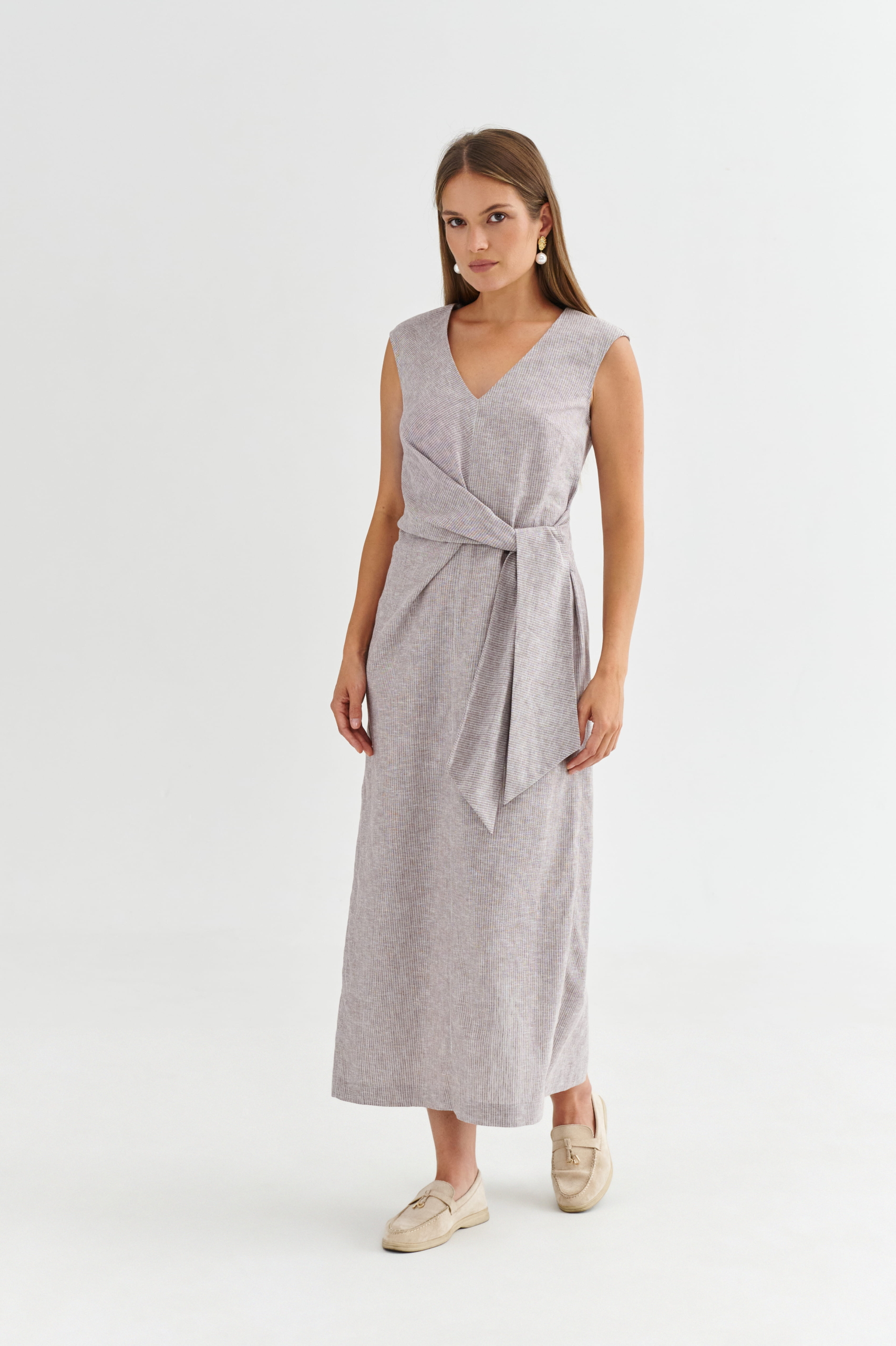 Elegancka sukienka do pracy midi z dekoltem V i wiązaniem w talii STELLA – jasny beżowy melanż