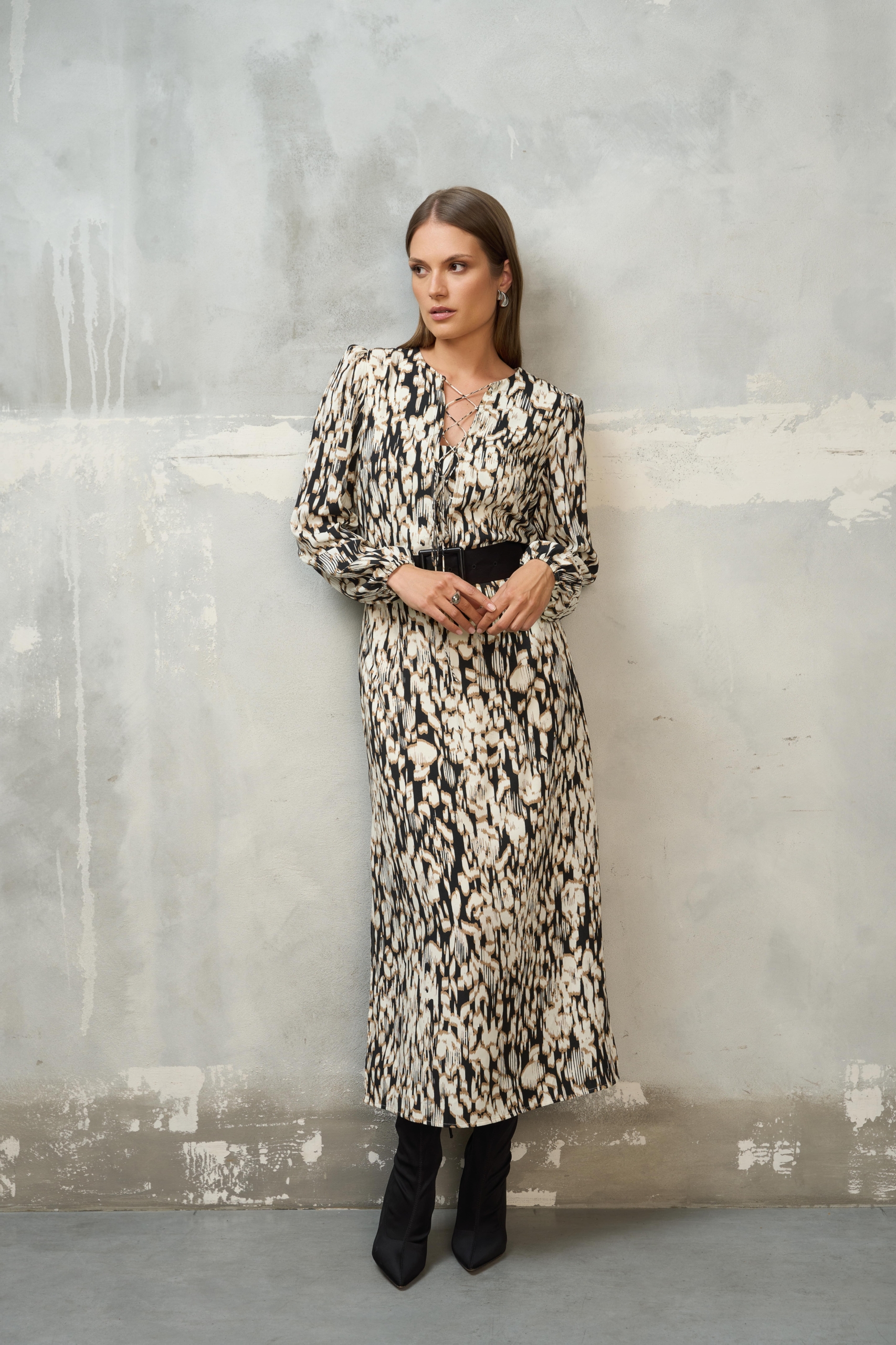 Dekolt z krzyżowanym wiązaniem subtelnie podkreśla linię szyi, a długość midi wysmukla i dodaje lekkości przy każdym kroku.