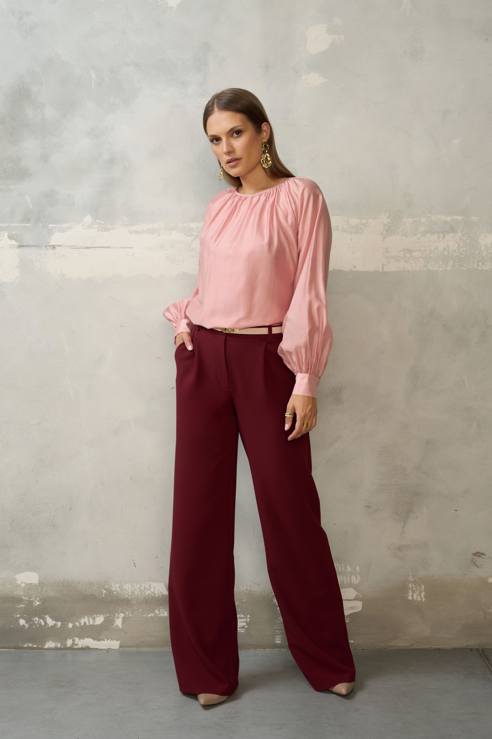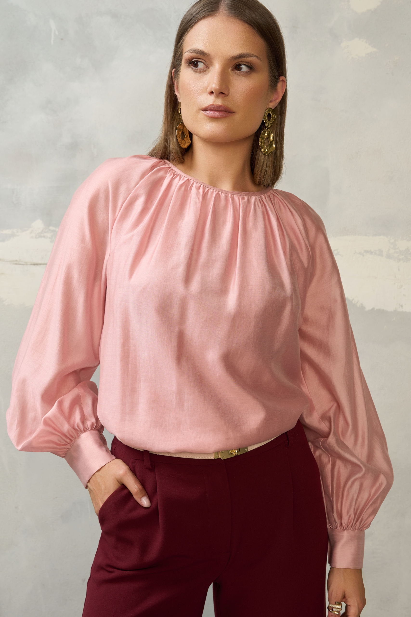 Różowa bluzka z subtelnym połyskiem to model, który przyciąga wzrok swoją prostotą i dopracowanym krojem.
