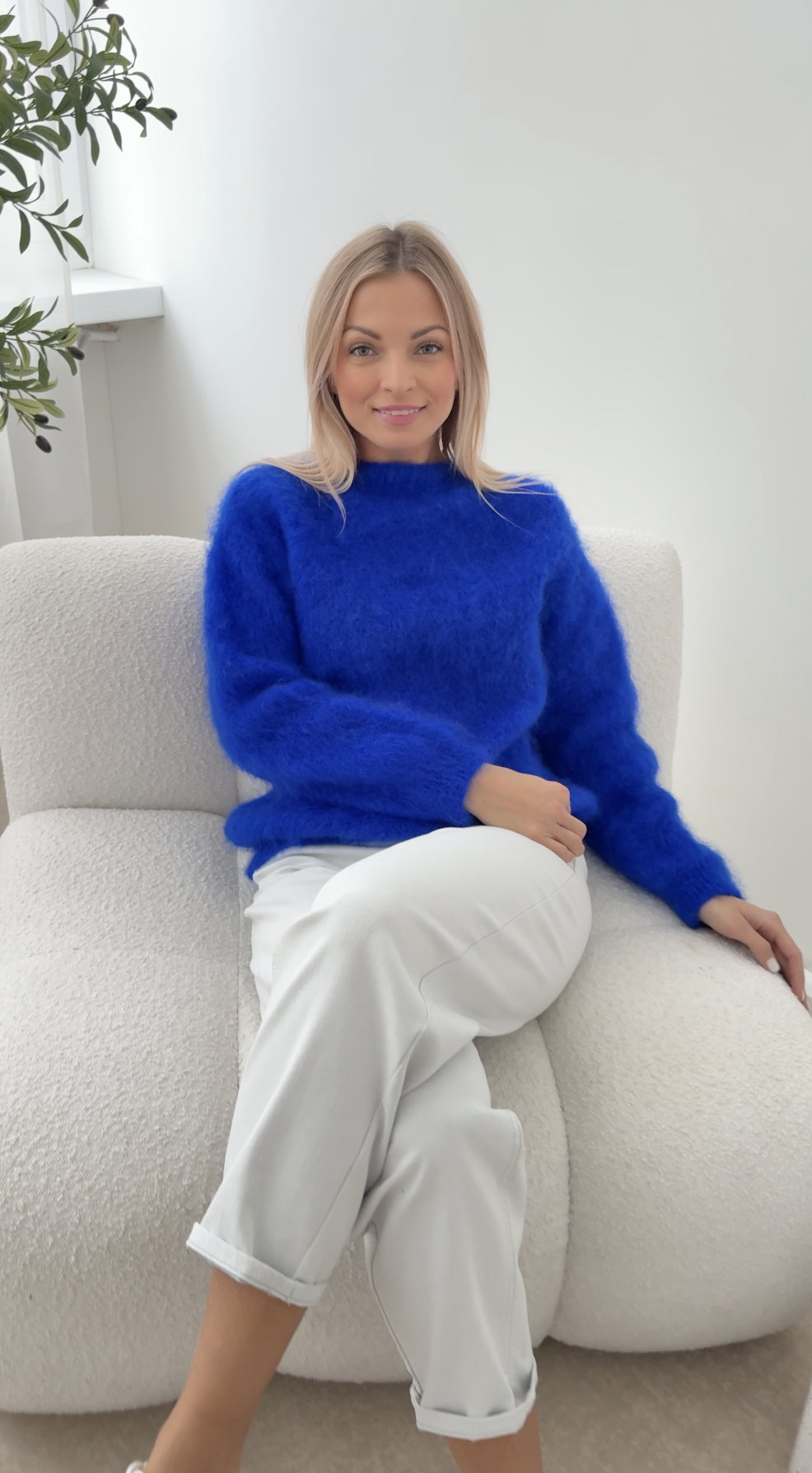 Kobaltowy sweter z 80% kid moheru to wybór, jeśli chcesz połączyć wyrazisty kolor z dopracowaną jakością.
