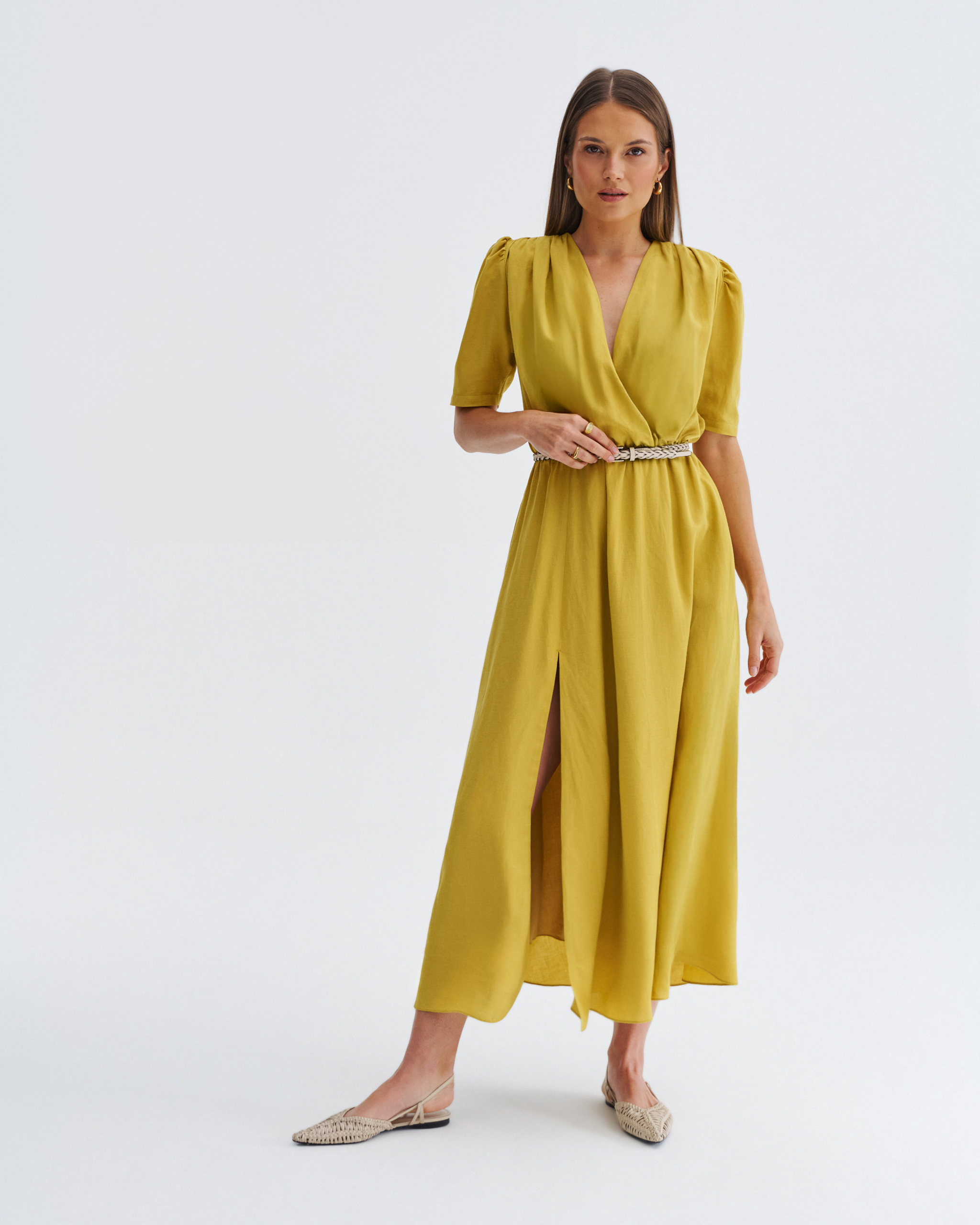 Limonkowa sukienka maxi z kopertowym dekoltem to model, który przyciąga wzrok kolorem i pięknie prezentuje się na sylwetce.