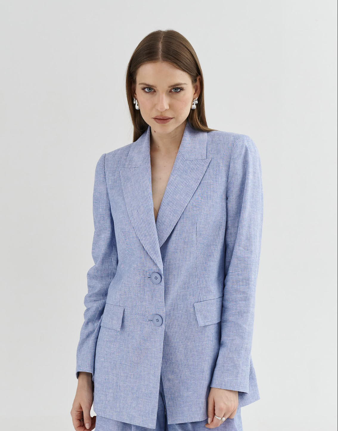 Prążek tworzy pionową linię, która pięknie wydłuża sylwetkę, a lekko taliowany krój podkreśla talię i nadaje proporcjom elegancki kształt.
