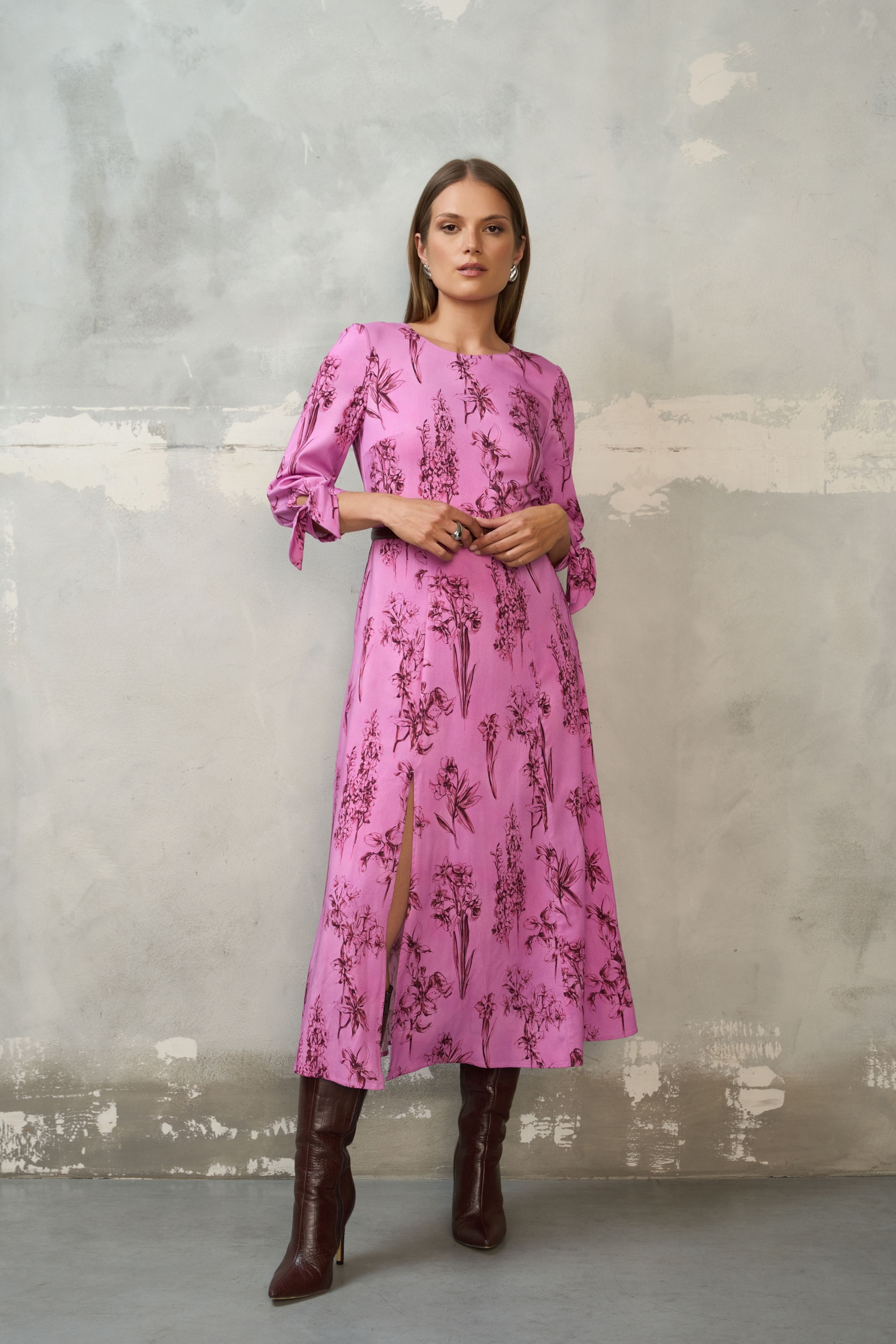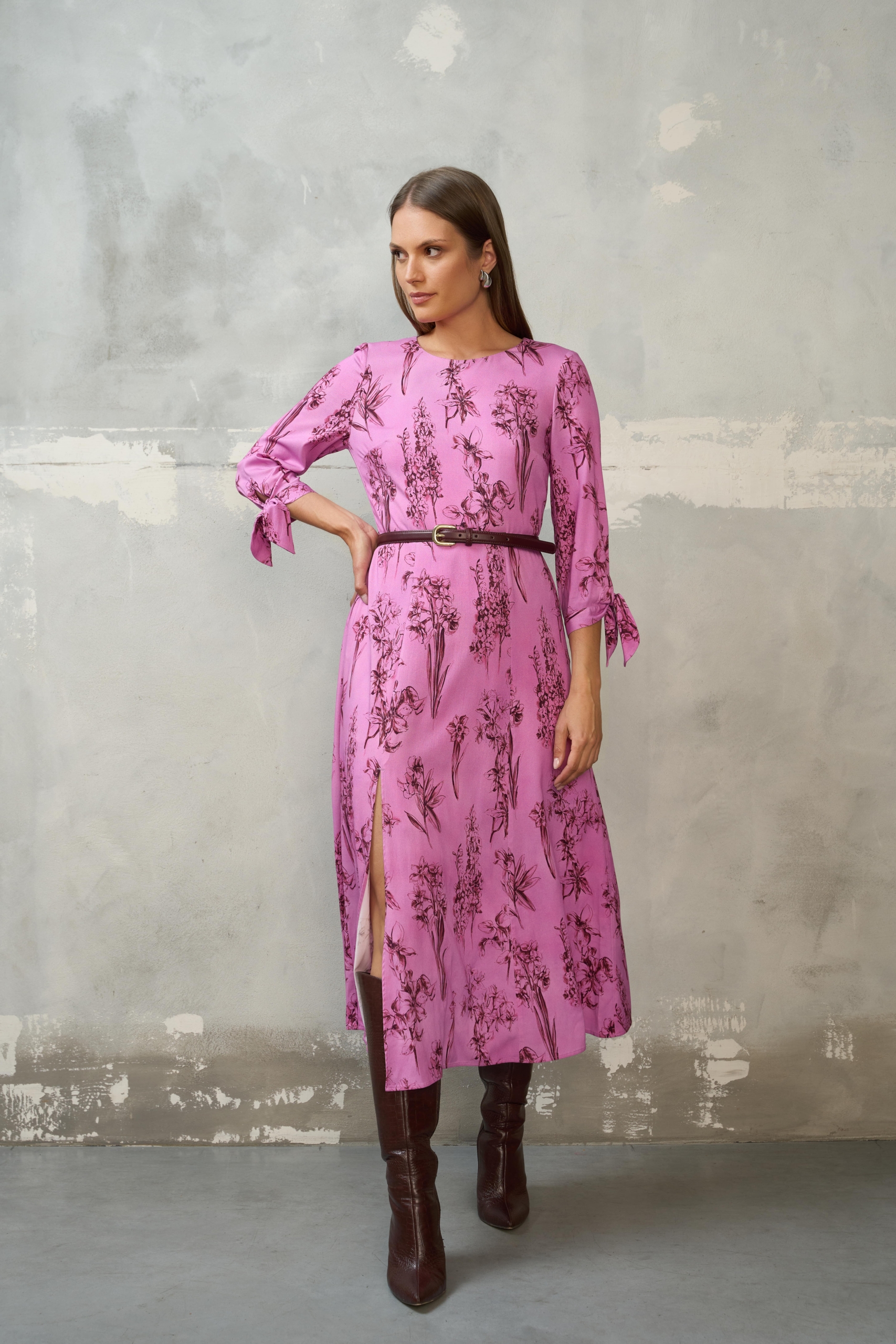 Rękawy ¾ z wiązaniami wprowadzają delikatny, kobiecy akcent, a rozcięcie z przodu subtelnie odsłania nogę.
