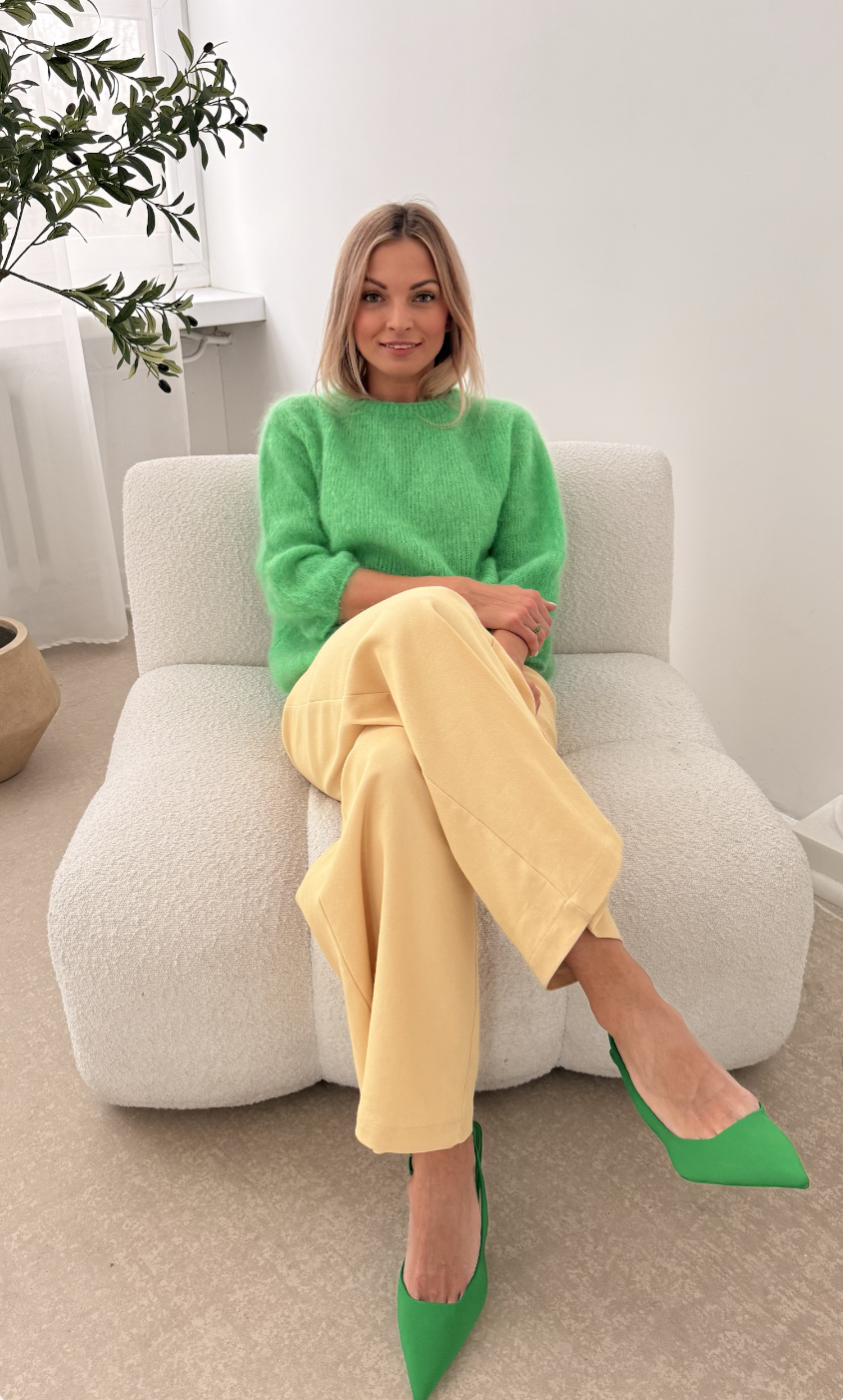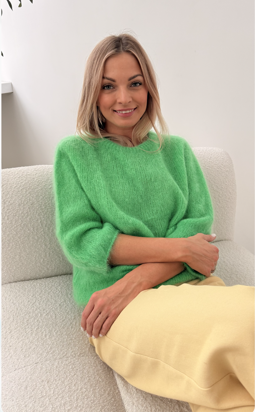 Sweter kid moher w soczystej zieleni – rękaw 3/4, miękka, puszysta dzianina.