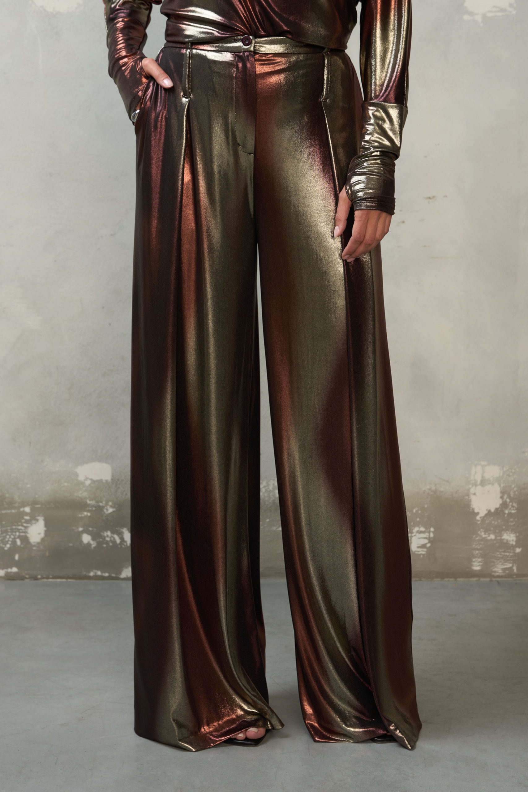 Szerokie spodnie z efektownej tkaniny w kolorze miedzi