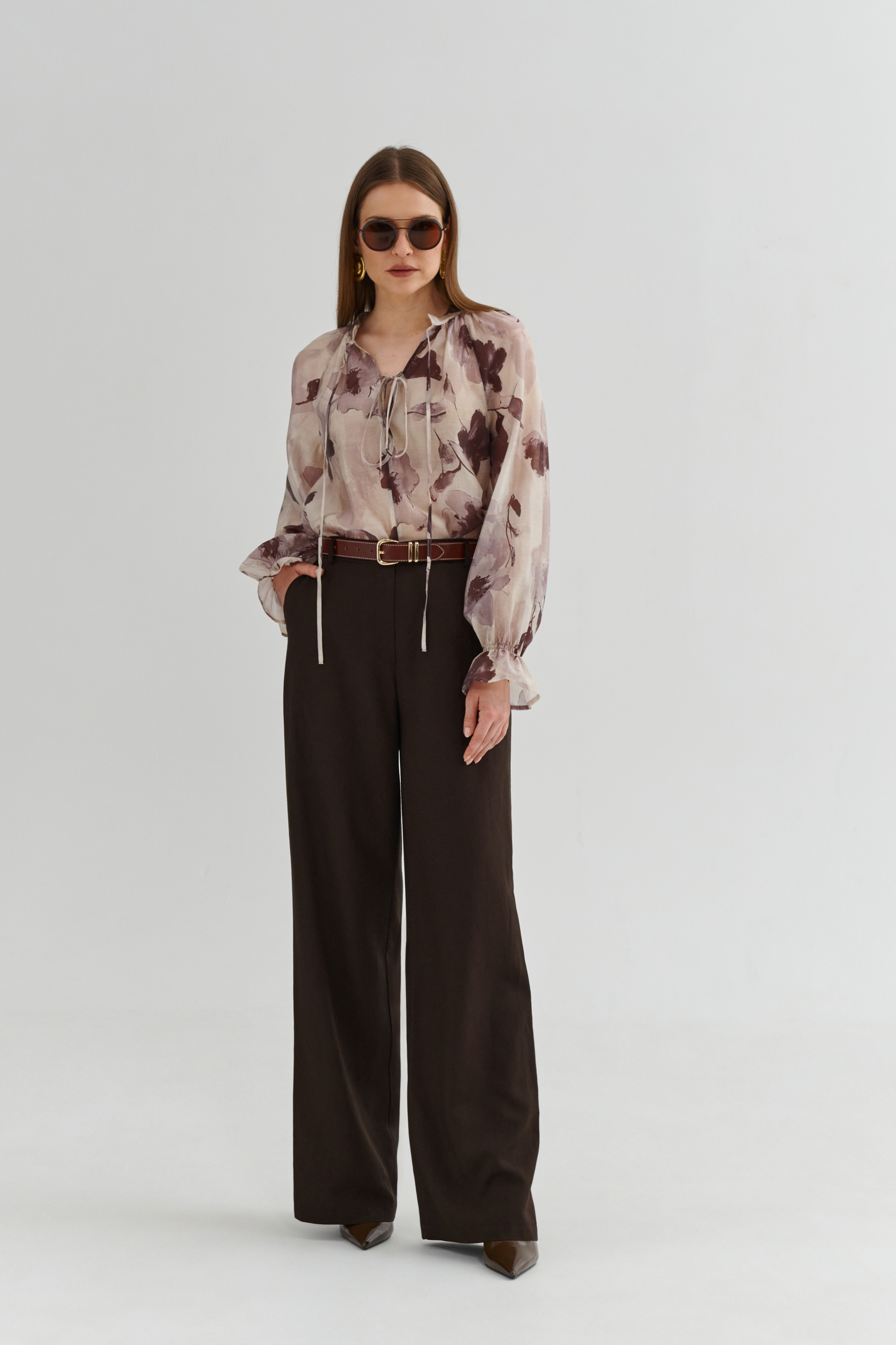 Ta bluzka w delikatny kwiatowy print pięknie układa się na sylwetce i nadaje stylizacji modny, dopracowany charakter.